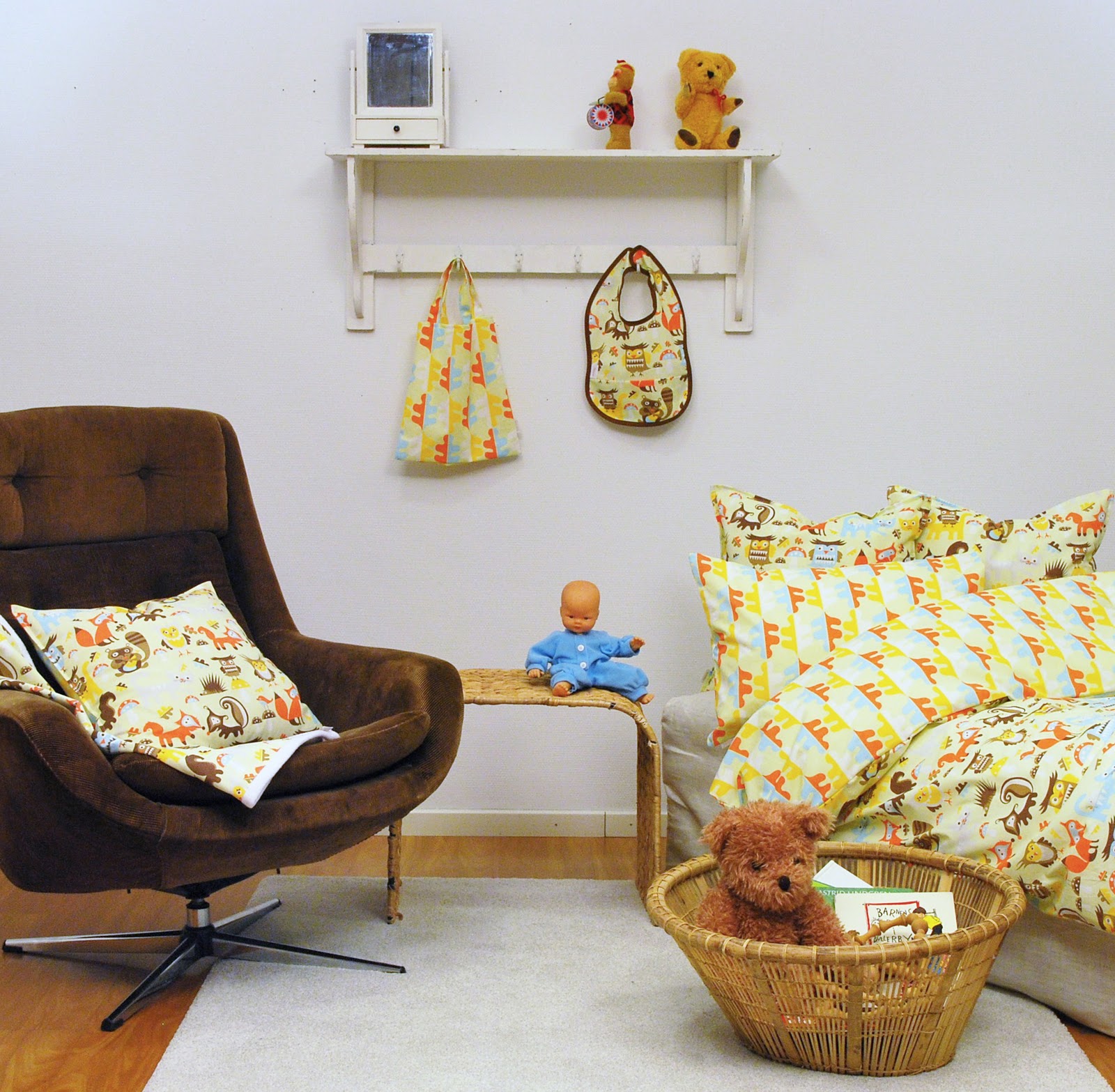 Mönstren finns på flera olika produkter som metervara, kuddar, bäddset, haklappar med mera. Kommer in till vår butik så småningom...